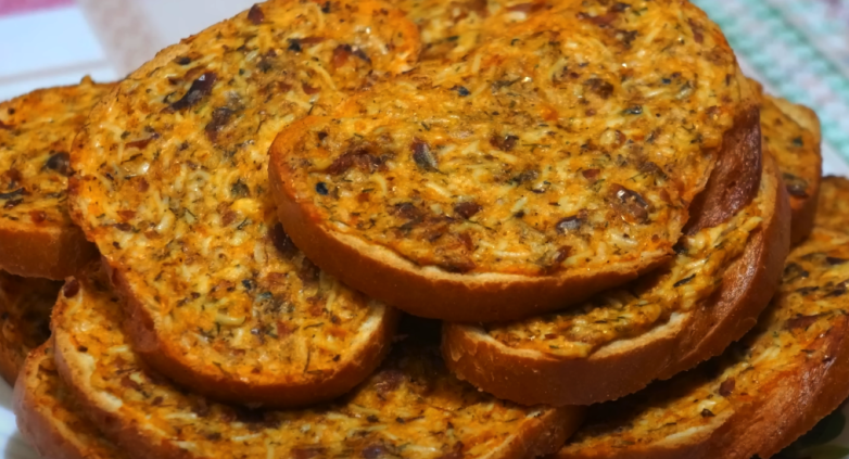 Яйца отварите, остудите и натрите на мелкой тёрке, также вмешайте в общую массу. Каждый ломтик батона намажьте столовой ложкой начинки, выложите на противень. Запекайте 15 минут при 180°. Подавать можно сразу после духовки — тёплыми и ароматными.