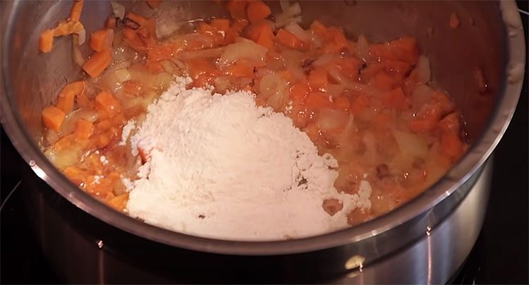 4. В глубокой сковороде или сотейнике разогрейте растительное масло. Мелко нарежьте лук, натрите морковь на средней тёрке. Обжарьте лук до прозрачности, затем добавьте морковь и готовьте ещё 2–3 минуты. Положите кусочек сливочного масла, дайте ему растопиться. Всыпьте муку и быстро размешайте, чтобы не образовались комки. Влейте сметану, при необходимости добавьте немного воды (около 50 мл) и тщательно перемешайте. Посолите, поперчите и доведите соус до кипения.