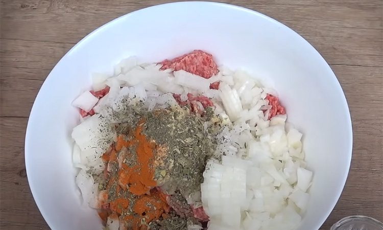 Сначала приготовьте начинку. Мелко нарежьте лук и добавьте его к фаршу. Всыпьте все специи — чеснок, паприку, итальянские травы, соль, перец. Всё тщательно перемешайте. Для заливки взбейте яйца со сметаной, добавьте немного соли и базилика, затем вмешайте половину натёртой моцареллы.