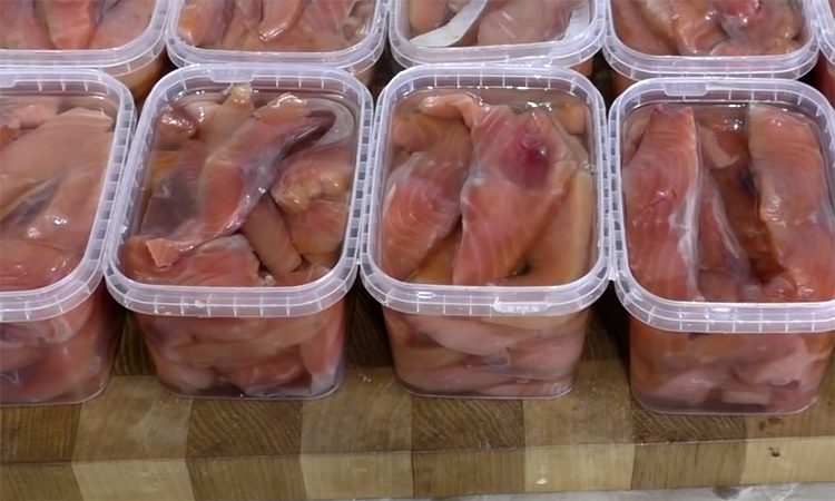 3. После 6 часов засолки аккуратно промойте рыбу под проточной водой, чтобы удалить излишки соли и сахара. Обсушите бумажными полотенцами. Нарежьте филе на порционные кусочки. Выложите их в стеклянные банки или контейнеры. Залейте оливковым или подсолнечным маслом так, чтобы оно полностью покрывало рыбу. При желании добавьте специи для аромата.