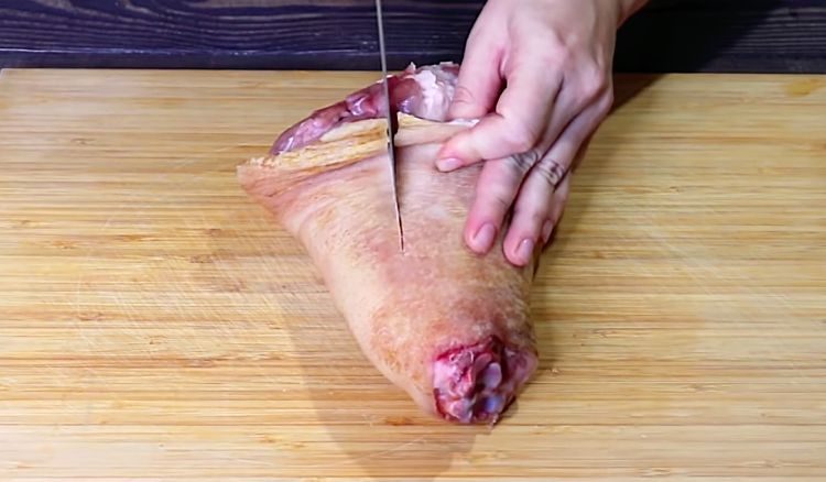 2. Используя нож, аккуратно удалите все кости из рульки. После этого отбейте мясо, слегка придав ему более ровную форму. Это поможет добиться более равномерного прогрева во время варки.