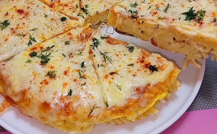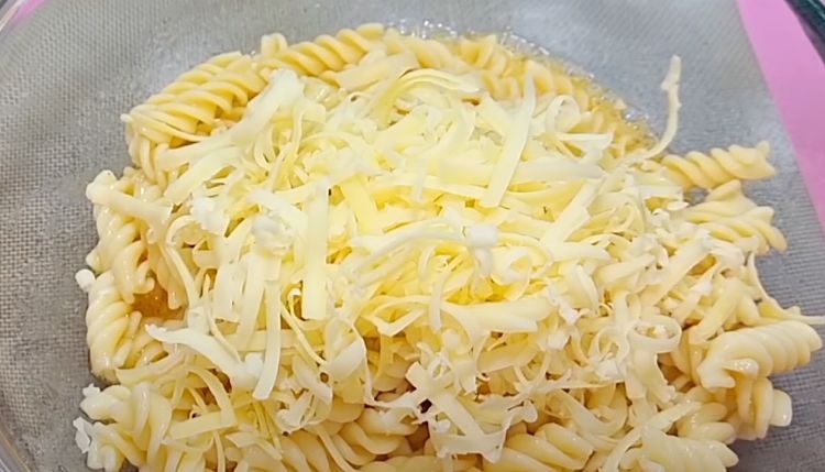За считанные минуты получили ленивый сырный пирог. Соединяем макароны, сыр и яйца