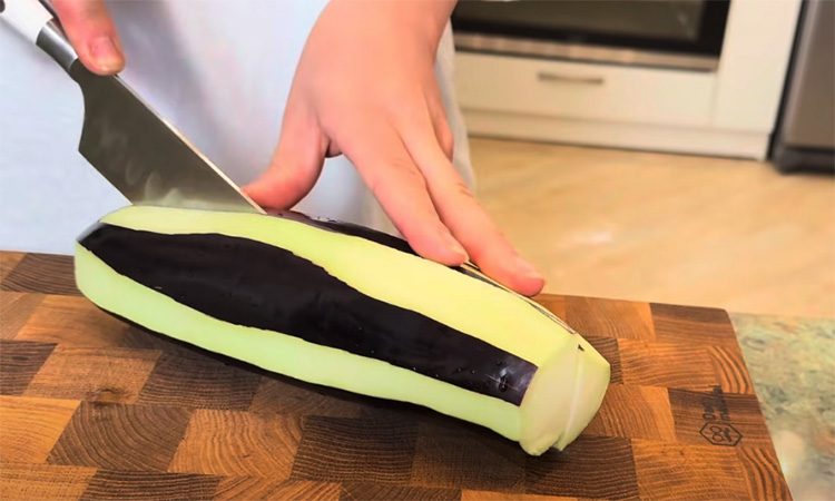 Очистите баклажаны от кожуры через один, нарежьте продольно на дольки толщиной около сантиметра. Опустите в кипящую воду, варите 3–4 минуты, затем откиньте на дуршлаг, придавите тарелкой и поставьте груз, чтобы стекла лишняя влага.