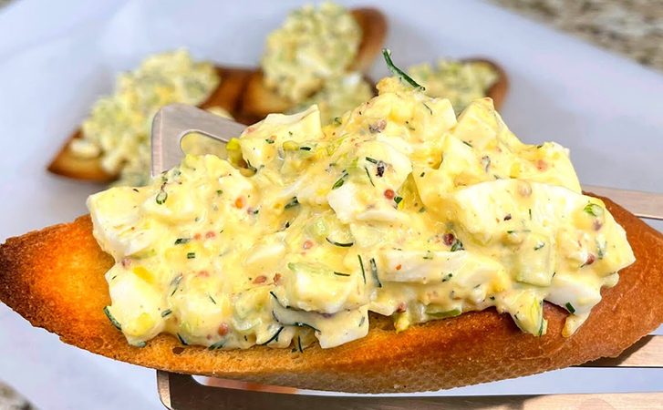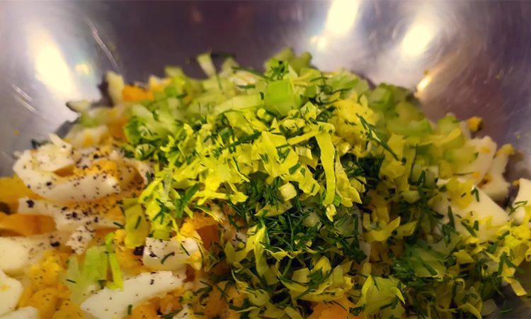 В конце можно добавить немного бальзамического уксуса для глубины вкуса, посолите и поперчите. Отварите яйца вкрутую в подсоленной воде ровно 9 минут, после чего охладите в ледяной воде и очистите. Нарежьте яйца с помощью шинковки машинкой или просто мелко порубите.