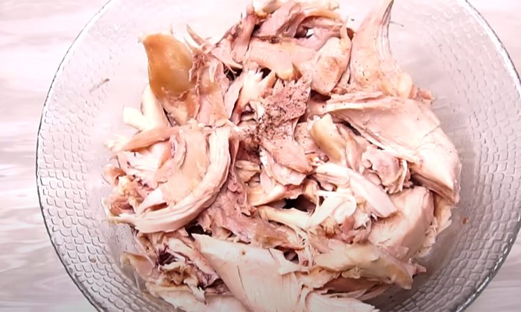 Куриное мясо отделите от костей, соедините с небольшим количеством свекольного сока для цвета и тщательно пробейте блендером до однородности. Постепенно влейте желатиновый бульон и снова хорошо перемешайте, чтобы масса стала гладкой и без волокон.