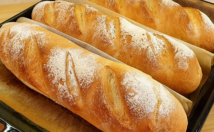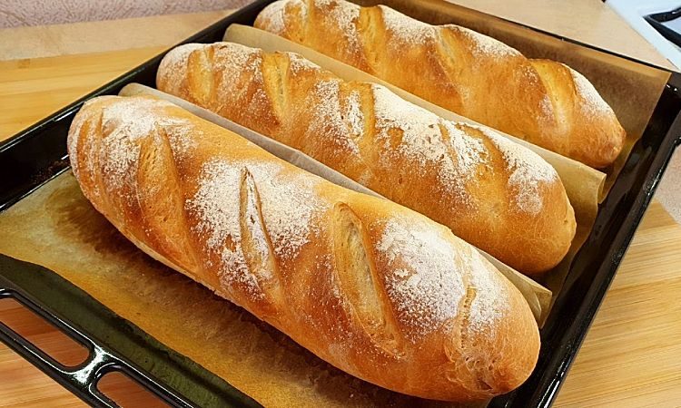 6.Сделайте острым ножом или лезвием несколько косых надрезов на каждом батоне. Это не только придаст хлебу красивый вид, но и позволит ему равномерно выпекаться. Легко присыпьте хлеб мукой, чтобы получить красивую корочку. Разогрейте духовку до 200°C (верх/низ). Поставьте противень с хлебом в духовку и выпекайте в течение 30 минут до золотистого цвета и хрустящей корочки.