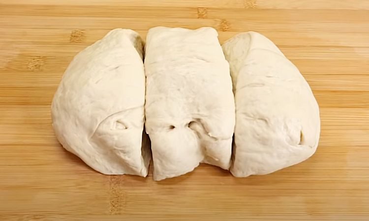 4. Накройте миску с тестом пищевой пленкой или чистым полотенцем и поставьте в теплое место для расстойки на 30-60 минут. Тесто должно увеличиться в размере в 1,5-2 раза. Это время необходимо для того, чтобы дрожжи начали работать и тесто поднималось. Когда тесто увеличится в объеме, выложите его на слегка присыпанную мукой поверхность и разделите на три равные части. Сформируйте из каждой части теста аккуратный рулет (батон). Если тесто липкое, можно слегка подмесить его, добавив немного муки.