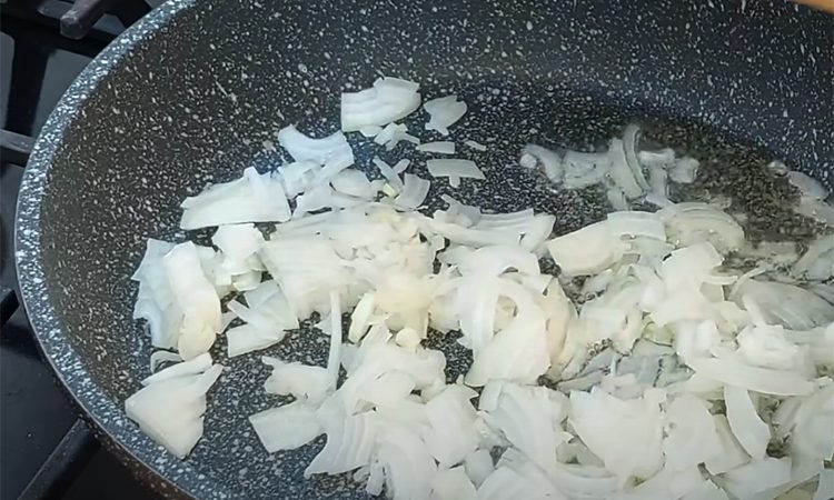 Разогрейте сковороду с ложкой говяжьего жира или растительного масла. Мелко нарежьте лук и сразу отправьте его на сковороду. Морковь натрите на крупной тёрке и добавьте к луку. Следом добавьте нарезанный сельдерей и сладкий перец. Посолите, всыпьте щепотку сахара и обжаривайте под крышкой до мягкости. Влейте томатный сок, перемешайте и тушите под крышкой 5–7 минут.