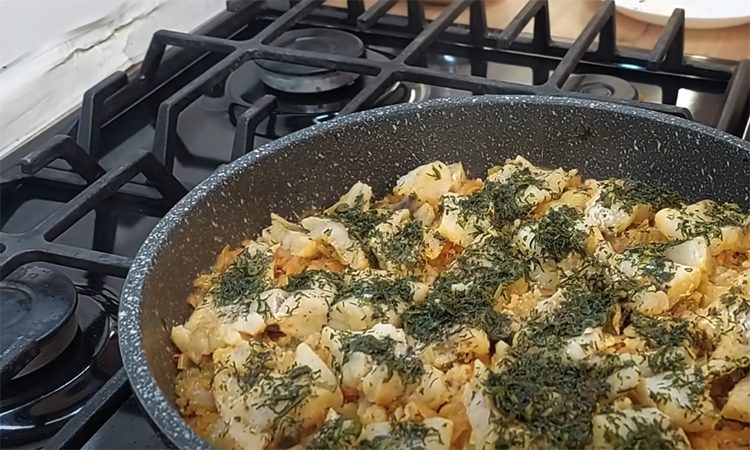 Добавьте рис, снова перемешайте и залейте горячей водой так, чтобы она покрыла всё содержимое. Посолите, добавьте специи. Варите под крышкой до полуготовности риса. Филе минтая нарежьте порционными кусками и присолите. Через 25–30 минут после начала варки аккуратно выложите рыбу поверх риса. Посыпьте зеленью и распределите сверху тонкие кусочки сливочного масла.