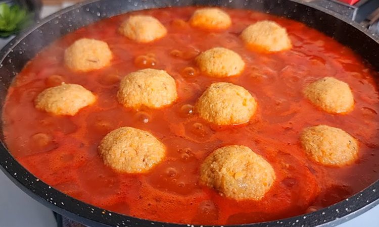 Сформируйте из массы шарики. Растопите авокадовое масло, добавьте муку и воду, хорошо размешайте, затем добавьте томатную пасту, посолите и поперчите. Погрузите шарики в соус и тушите на медленном огне по 5 минут с каждой стороны.