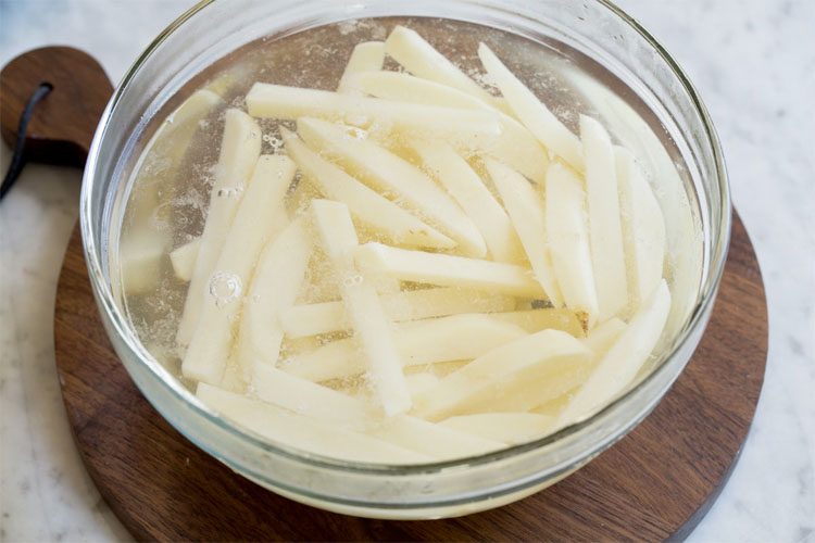 2. Переложите нарезку в миску, залейте холодной водой и добавьте уксус. Вода должна полностью покрывать картофель. Оставьте замачиваться на 10 минут. Уксус помогает сохранить форму картошки, а вода вытягивает излишки крахмала — это сделает картофель хрустящим снаружи и мягким внутри.