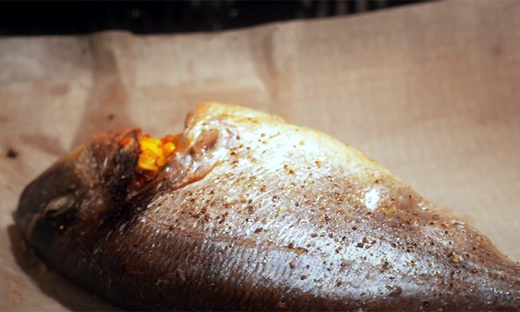 Фаршировка рыбы овощной начинкой перед запеканием позволяет равномерно распределить вкус по всей тушке. Само мясо сохранит сочность за счет масла, соли и пряностей, готовить же будем на невысокой температуре, что сделает рыбу еще и невероятно мягкой.