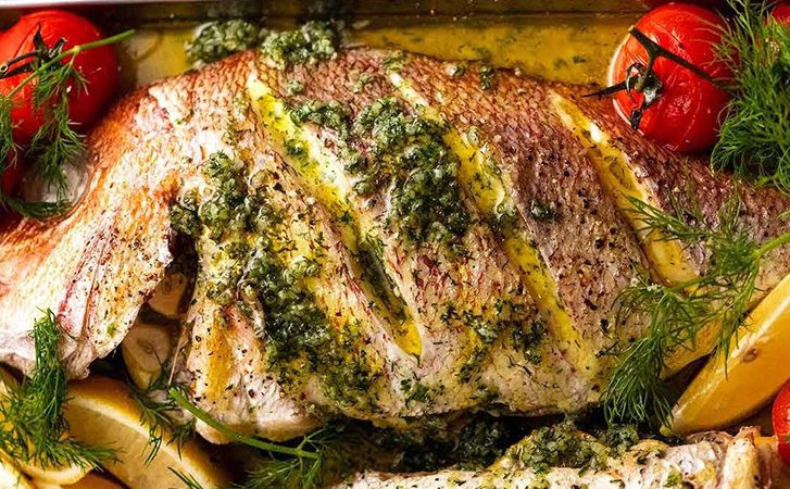 В конце приготовления нарежьте петрушку, добавьте лимонный сок и оливковое масло. Смажьте рыбу этой смесью, пока она горячая.