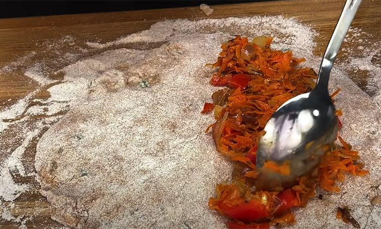 Нарежьте лук, натрите морковь, нарежьте перец мелкими кубиками, обжарьте всё на масле до мягкости с добавлением соли, паприки, черного перца и прованских трав, накройте крышкой и доведите до готовности. Выложите начинку на одну половину лепешки, накройте второй, прижмите края вилкой.