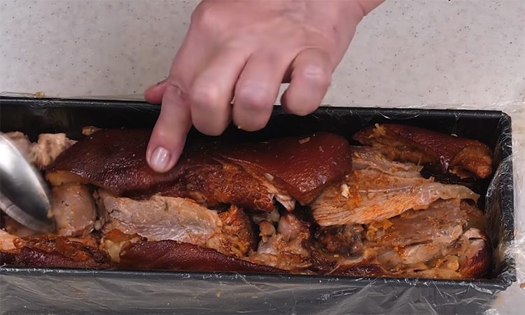 Варите под крышкой на минимальном огне 2-3 часа до мягкости, периодически переворачивая рульки и при необходимости доливая воду. Готовое мясо остудите, отделите кости и разложите мясо на пищевую плёнку, формируя прямоугольник, заполните пустоты срезанным мясом.