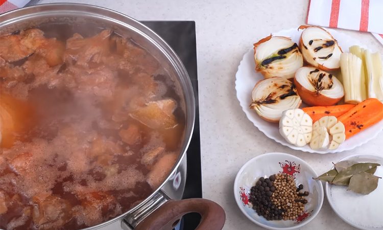 Хорошо очистите и промойте рульки, замочите их на пару часов в холодной воде. В большую кастрюлю положите луковую шелуху, выложите рульки и залейте водой так, чтобы мясо было полностью покрыто. Доведите до кипения, снимите пену. Добавьте жареный лук, морковь, чеснок, сельдерей, соль, лавровый лист и специи.