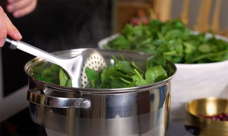Грузинский пхали из шпината сочетает свежесть зелени с характерными пряностями и ароматами чеснока и хмели-сунели. В этом рецепте шпинат быстро бланшируется, а затем перемалывается с орехами и зеленью, что придает блюду особенную нежность и насыщенность. В самом конце на каждую заготовку выкладываются зерна граната — в этом исполнении добавки шпината попросят даже дети.