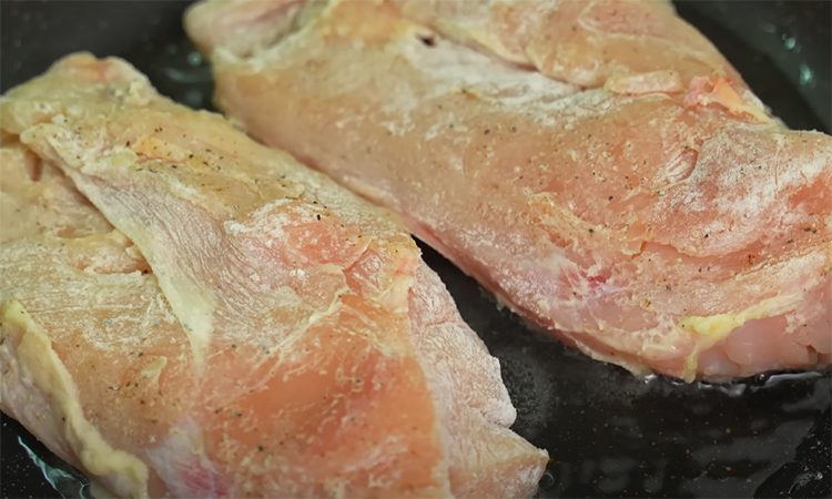 Нарежьте каждое филе сеткой: сначала по диагонали в одну сторону, затем в другую, не прорезая до конца. Посолите и поперчите с обеих сторон, обваляйте в муке и аккуратно стряхните излишки. Разогрейте масло и выложите грудки на сковороду надрезами вниз. Обжаривайте на сильном огне около двух минут, затем переверните и жарьте ещё две минуты до румяной корочки.