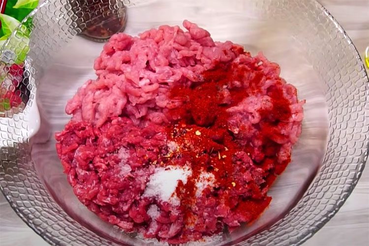 1. В большой миске соедините говяжий и свиной фарш. Фарш можно использовать готовый, но если есть возможность — лучше перекрутить мясо самостоятельно: говядину из лопатки или шеи, а свинину из шеи или грудинки. Всыпьте по вкусу черный перец, красную паприку и (по желанию) немного измельченного перца чили. Не забудьте посолить — примерно 1 ч. ложка соли на это количество мяса (по вкусу).