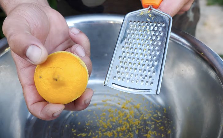 2. Тёркой натрите только жёлтую верхнюю часть кожуры каждого лимона прямо в ёмкость. Старайтесь не затрагивать белую часть (альбедо), потому что она придаст напитку горечь и неприятный вкус. Наберитесь терпения, чтобы не захватить белую мякоть — лучше меньше, но качественной цедры.