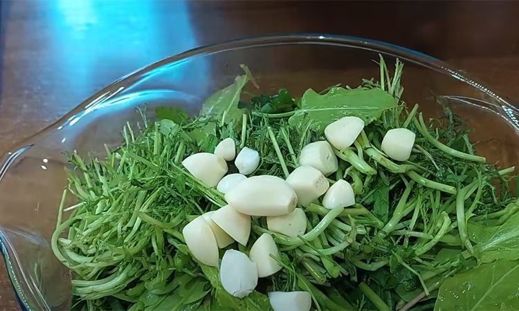 Зелень тщательно промойте, замочите на 20 минут в подсоленной воде, затем обсушите. Нарежьте всю зелень вместе с черешками и стеблями, добавьте к ней зелёный лук, укроп, щавель и рукколу, если есть. Почистите чеснок, измельчите его.