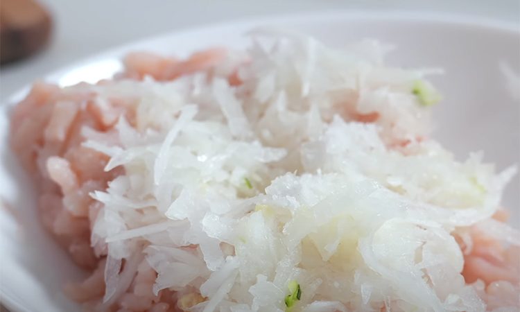 Кабачок натрите на крупной тёрке, присыпьте солью, перемешайте и оставьте на 5–10 минут, чтобы выделился сок. Куриное филе вместе с половиной лука пропустите через мясорубку или нарежьте мелко, добавьте немного соли, чёрного перца и перемешайте. По желанию можно добавить любимые специи или зелень.