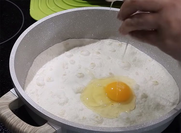 2. Поставьте сковороду на средний огонь. Добавьте немного растительного масла и равномерно распределите по поверхности. Выложите лаваш на горячую сковороду. Сразу же разбейте яйцо прямо на лаваш.