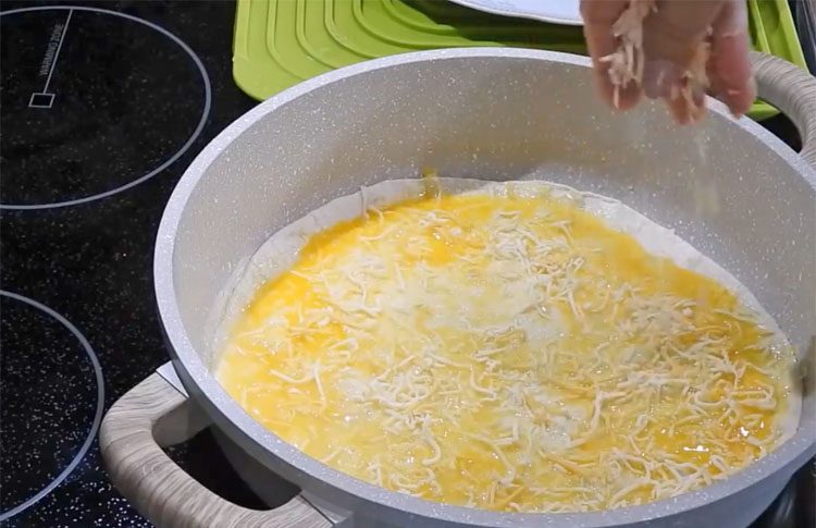 3. С помощью ложки или кисточки аккуратно размажьте яйцо по всей поверхности, стараясь распределить его равномерно. Сверху посыпьте половиной натёртого сыра. Готовьте 1–1,5 минуты, пока яйцо немного схватится, а сыр начнёт плавиться.