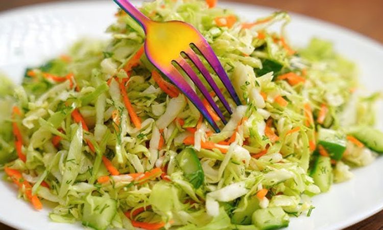 Легкий летний салат из капусты с огурцами и пряным горячим маслом просто и вкусно