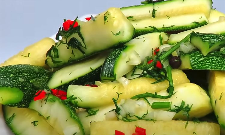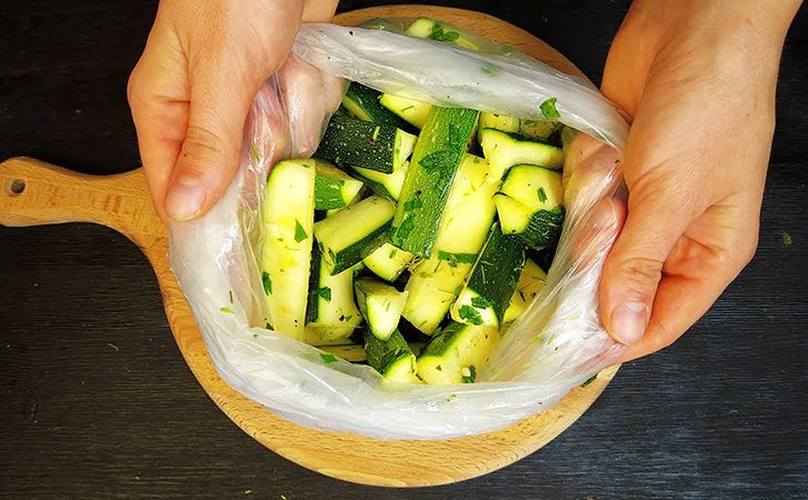 Плотно закройте пакет и тщательно встряхните, чтобы овощи равномерно перемешались со специями. Оставьте кабачки в холодильнике минимум на 4–5 часов, чтобы они промариновались. За это время кабачки станут ароматными и хрустящими.