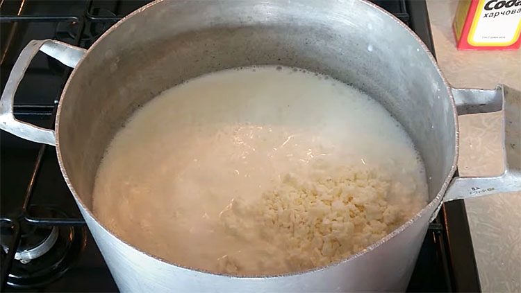 1. В высокой кастрюле (желательно алюминиевой) доведите до кипения 1 литр молока. Как только молоко закипит, всыпьте творог и начните варить, постоянно помешивая деревянной лопаткой.