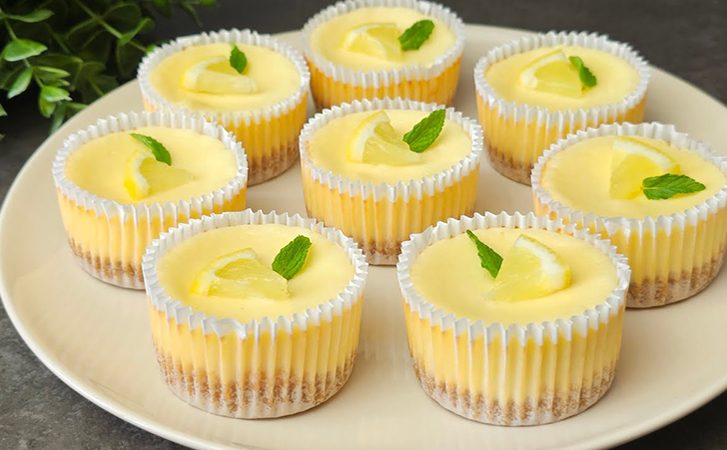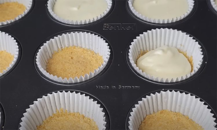 Взбейте до однородности. Выложите крем поверх песочной основы в формочках и разровняйте. Выпекайте при 180°С 20 минут в разогретой заранее духовке.