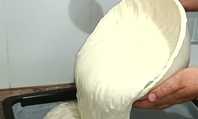 Растворите дрожжи в небольшой части тёплой воды (около 150 мл), добавьте сахар и размешайте до однородности. Влейте оставшуюся воду, добавьте соль и растительное масло. Постепенно всыпайте просеянную муку, постоянно размешивая тесто венчиком или ложкой — оно должно остаться жидким, мягким и липким, без плотности. Накройте тесто крышкой или полотенцем и оставьте в тёплом месте на 45 минут.