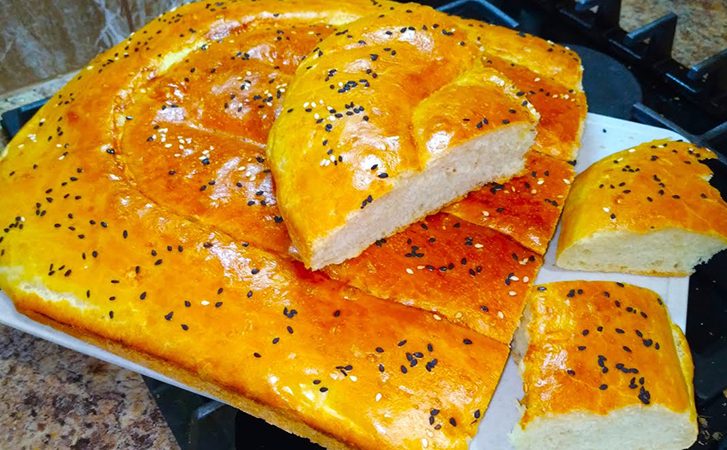 Оно должно увеличиться в объёме в 2–3 раза и стать очень пузырчатым. Аккуратно вылейте тесто в большую прямоугольную форму, смазанную маслом. Смешайте желток с ложкой воды и смажьте поверхность теста. Посыпьте сверху кунжутом. Не давайте тесту подниматься повторно — сразу поставьте в разогретую духовку. Выпекайте при 210°C без конвекции, только нижний и верхний тен, в течение 45 минут.
