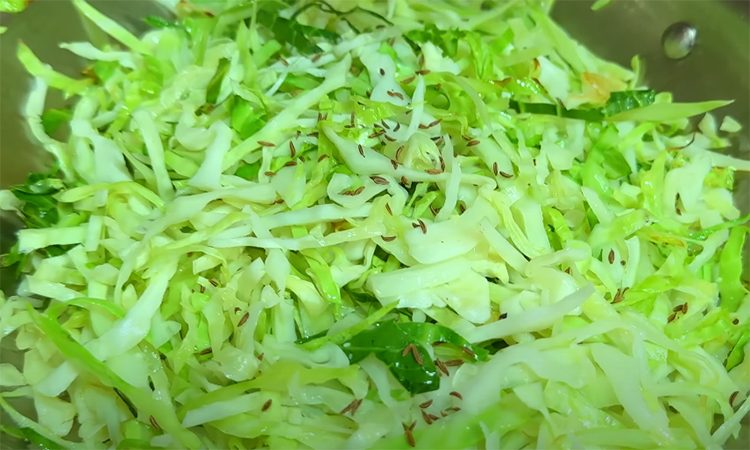 Нашинкуйте капусту, выложите на сковороду с топлёным сливочным маслом или растительным маслом, готовьте на сильном огне около пяти минут, чтобы капуста осталась слегка хрустящей. Добавьте щепотку тмина, немного соли и свежемолотый чёрный перец, перемешайте и снимите капусту с огня.