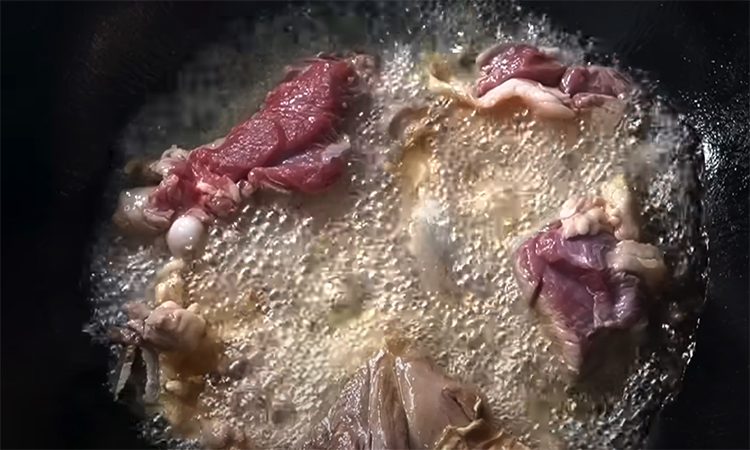 Заранее замочите нут в кипятке и оставьте на ночь, затем промойте. Рис обильно посолите, залейте горячей водой (45–50°С) и оставьте набухать на 1–2 часа. Баранину нарежьте крупными кусками, немного присолите. Разогрейте в казане растительное масло, добавьте курдючный жир и доведите до высокой температуры. Выложите мясо, обжаривайте до яркой румяной корочки, затем добавьте нарезанный лук и часть зиры с измельчённым чёрным перцем.