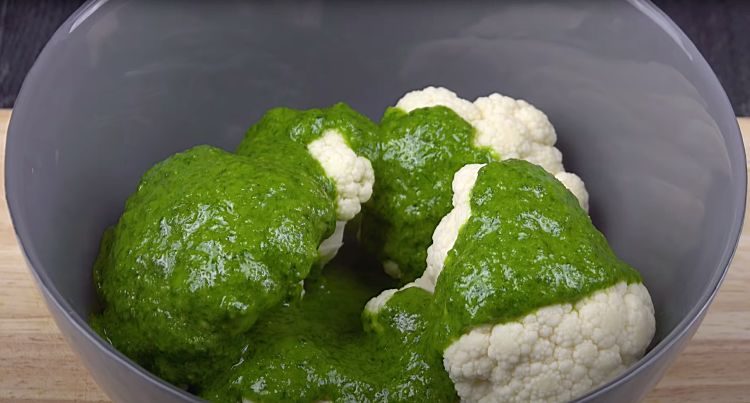 2. Для начинки разделите цветную капусту на крупные соцветия. Для этого используйте нож, чтобы аккуратно отрезать стебли, а сами соцветия нарежьте крупно (размером с грецкий орех). Положите капусту в миску и вылейте сверху песто. Хорошо перемешайте, чтобы капуста равномерно покрылась песто. Это придаст начинке вкус и аромат.