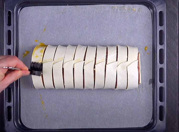 5. На противень, застеленный пергаментом, разверните лист слоеного теста. Убедитесь, что тесто разморожено и поддается работе. Выложите мясной рулет (в пленке) в центр теста. Аккуратно отрежьте четыре угловых куска теста (каждый размером примерно 5 см), чтобы впоследствии завернуть их по бокам рулета. Сделайте надрезы по длинным сторонам теста через каждые 2-3 см. Эти надрезы создадут декоративный узор на корочке и помогут тесту равномерно пропечься. Смажьте тесто взбитым яйцом с помощью кисточки — это придаст золотистый цвет при запекании.