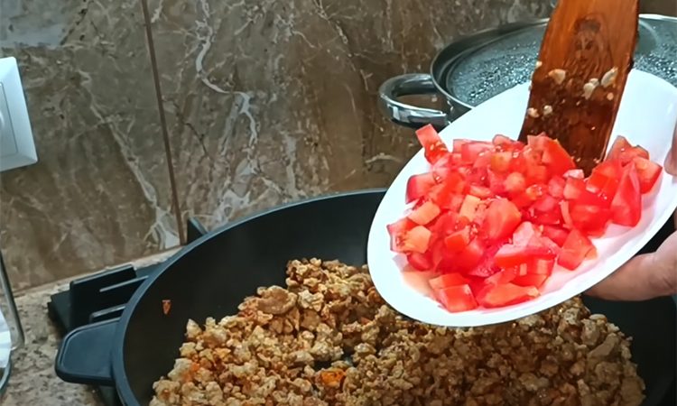 Посолите, поперчите, добавьте паприку и хмели-сунели, хорошо перемешайте. Положите мелко нарезанный помидор и готовьте под крышкой на среднем огне 8–10 минут. Параллельно в кипящую подсоленную воду отправьте нашинкованную капусту, нарезанную лепестками. Закройте крышкой и бланшируйте 2–3 минуты, чтобы капуста стала мягкой, но не разварилась.