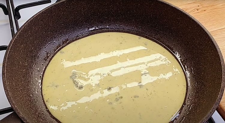 3. Нагрейте сковороду на среднем огне и добавьте немного растительного масла, чтобы оно покрывало дно сковороды. Масло можно использовать любое — подсолнечное, оливковое или другое. Когда сковорода разогреется, аккуратно вылейте яичную смесь на сковороду и распределите её по поверхности с помощью ложки или вилки, чтобы она равномерно покрыла дно.