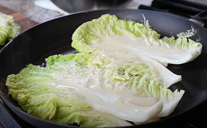 4. Разогрейте сковороду на среднем огне и налейте немного растительного масла (примерно 2–3 ст. ложки). Каждый лист капусты полностью окуните в кляр, убедившись, что он хорошо обволакивает поверхность. Осторожно выложите лист на сковороду. Жарьте по 2–3 минуты с каждой стороны до золотистой корочки. Лист должен стать хрустящим, но не подгореть. Выложите готовые листья на бумажные полотенца, чтобы убрать лишнее масло.