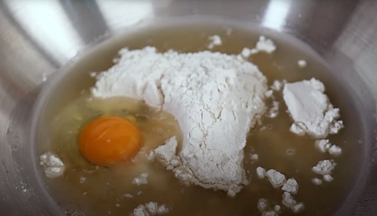 2. В глубокой миске взбейте яйцо венчиком или вилкой. Добавьте к яйцу стакан тёплого бульона и соль. Постепенно всыпайте муку, постоянно перемешивая, чтобы не образовывались комки. В результате должно получиться однородное тесто консистенции жидкой сметаны — как для блинов.
