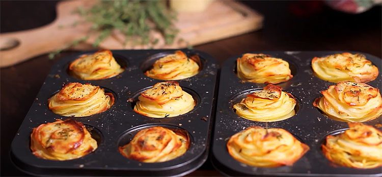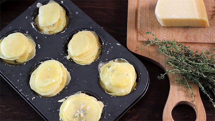 4. Сложите ломтики картофеля стопками (по 10–15 ломтиков на одну «порцию»). Удобно делать это, немного сдвигая ломтики друг относительно друга, чтобы они напоминали веер. Аккуратно вставьте каждую стопку в отдельную ячейку формы. Можно слегка прижать сверху, чтобы ломтики уложились плотнее. При желании сверху ещё раз поперчите или посыпьте щепоткой сыра.