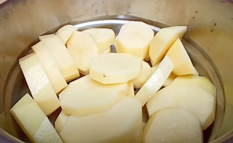 1. Очистите картофель и отварите в подсоленной воде до полной мягкости (около 20–25 минут после закипания). Слейте воду и разомните картофель в пюре, пока он ещё горячий. Не добавляйте молока или масла — пюре должно быть плотным, а не кремовым.