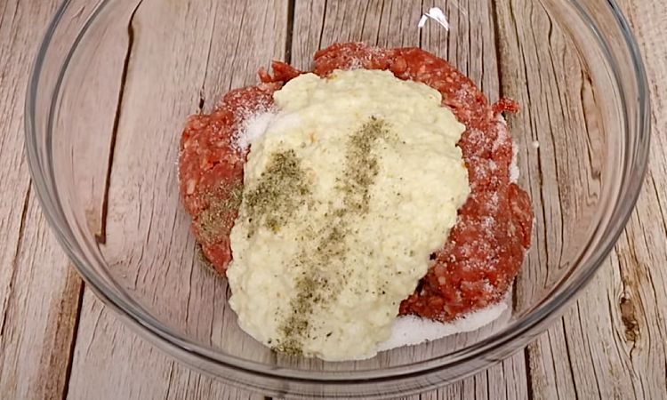 3. Разломите хлеб на кусочки и залейте молоком. Оставьте на 5 минут, чтобы он размягчился. Очистите вторую луковицу и нарежьте её крупными кусками. В чаше блендера соедините размоченный хлеб и лук. Измельчите до получения однородной массы. В большой миске соедините полученную массу с говяжьим фаршем. Добавьте соль и перец по вкусу. Хорошо вымесите руками или ложкой до однородности.