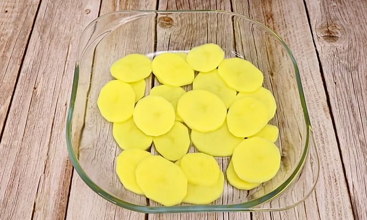 2. Очистите картофель и нарежьте его тонкими кружочками (толщина примерно 2–3 мм). Выложите картофель равномерным слоем на дно формы для запекания (примерный размер формы — 20×30 см).