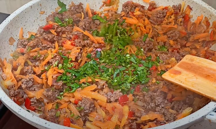 3. К обжаренным овощам добавьте говяжий фарш. Хорошо перемешайте и разомните лопаткой, чтобы не было комков. Приправьте кориандром, паприкой и солью по вкусу. Накройте крышкой и готовьте на среднем огне 6–7 минут, периодически помешивая.