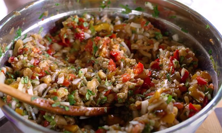 Затем аккуратно снимите кожицу с перцев и баклажанов, удалите семена и плодоножки. Мякоть нарежьте крупными кусочками. Помидоры также очистите, нарежьте. Смешайте все овощи в глубокой миске, добавьте лук, всю зелень, измельчённый чеснок.