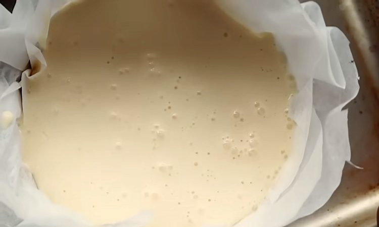 4. Возьмите круглую форму диаметром 15 см (можно использовать разъёмную). Выложите в неё два слоя пергаментной бумаги, придавая бумаге слегка мятую форму, чтобы она легче ложилась по краям и немного выходила за пределы формы (так легче будет доставать чизкейк). Бумагу не смазывайте – жир от сыра и сливок не даст чизкейку прилипнуть. Перелейте смесь в подготовленную форму, аккуратно разровняйте верх.