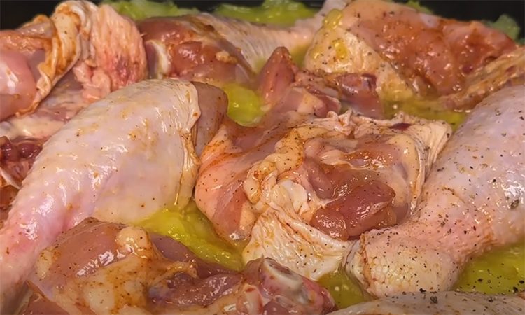 Курицу нарежьте порционными кусками, посыпьте приправой, солью и перцем, добавьте немного растительного масла, тщательно натрите специями каждый кусочек и оставьте мариноваться на 15–20 минут. Лук нарежьте небольшим кубиком.